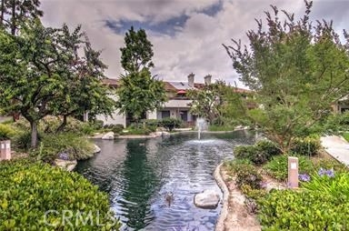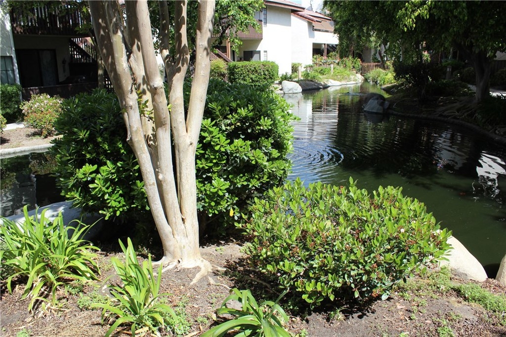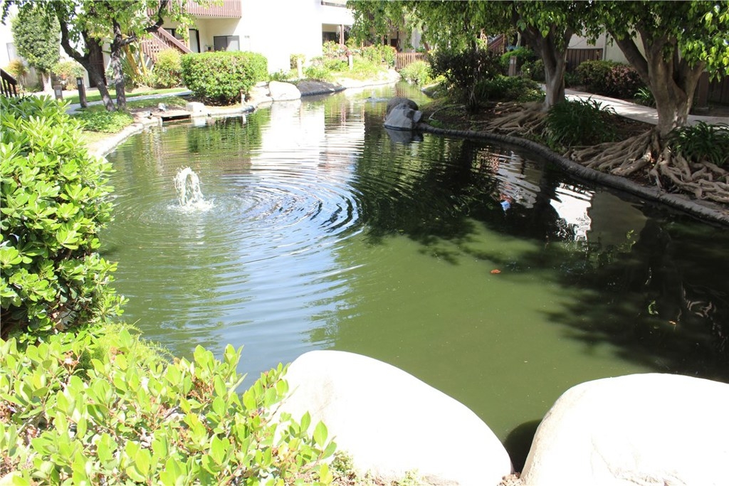 Remodeled first floor condo overlooking a relaxing flowing pond. This home features a large living room with a gas fireplace opening into the dining room. Eat at the breakfast bar or cute dining room. The huge master suite has triple closet doors and a private balcony to enjoy the outdoor tranquility of the zen-like pond. Updated dark hardwood flooring throughout with travertine tile flooring in the bathroom. The kitchen features dark wood cabinets, granite counter top and custom design tiled back splash. Smooth ceilings, recessed lighting, ceiling fans, and crown molding throughout the home. The community provides maintenance and usage of the swimming pools, spa, tennis courts, and clubhouse. 2 car detached garage.