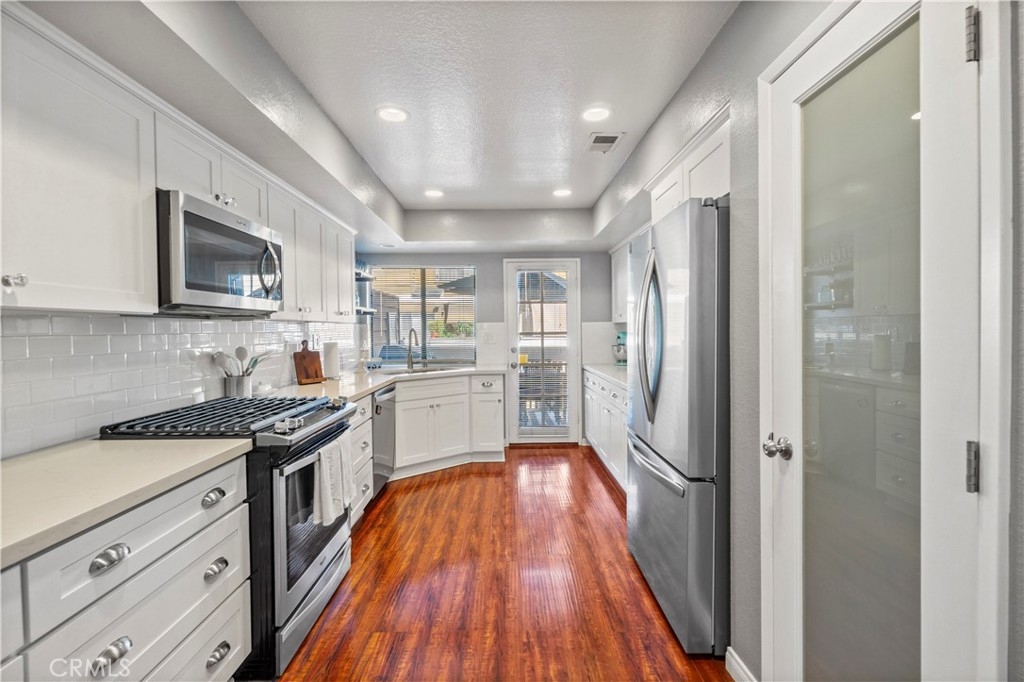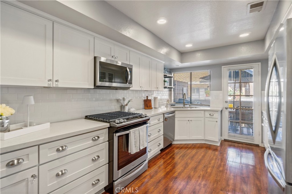 Beautifully appointed 3 bedroom 3 full bath Townhome in the scenic community of Meadow Brook Village! Home has been lovingly cared for and boasts upgrades that adds to it's modern convenience and charm. Kitchen has been wonderfully upgraded with quartz countertops, stainless steel appliances. farm style sink, shaker cabinets with under cabinet lighting, recessed lighting, a spacious walk-in pantry and a lot of cabinet space. It's a kitchen made for the gourmets at heart! Kitchen also is easily accessible to the dining/family room areas which makes it a perfect place for entertaining. Family/dining room has high vaulted ceilings that opens up the environment, making the area fell much larger than it's actual square footage, with gas fireplace to bring additional warmth and enjoyment. One of the bedrooms is on this level, which is currently being used as an office. Bathroom on this level has been upgraded, as will as the hall bathroom on the upstairs level. New tile flooring, vanities, tubs, fixtures, and wainscoting give each bathroom a modern look with a traditional feel. Upstairs is the 2nd bedroom which has a ceiling fan to add to its decor. This bedroom and the one downstairs are roomy in size, with sliding mirror closets. Large ceiling fan with remote, overlooks the staircase. The primary bedroom is large with high vaulted ceilings. Within the bedroom is the bath area with two sinks, cabinet vanities, and adjacent full bath. The closet space is deep, which provides a lot of room for personal belongings. Blinds in both upstairs bedrooms were installed a few years ago, with dual pane windows in both rooms. At the bottom level of this home, is an oversized two car garage. Even with washer/dryer hookups, and shelving on both sides of the garage, which are fantastic for storage, there's still plenty of room for most vehicles. Just last year, a new garage motor and track were installed with remotes. A/C and Furnace were installed in 2017, with the home providing a Nest Thermostat for easy settings and convenience. Phantom screens were installed on all three doorways, to keep bugs out and to let fresh air come in! Laminate floors are throughout the whole home, which gives continuity in adding to decor this home lovingly presents. This community provides ponds and greenery around the common areas, with tennis courts, pool and spa, two bar-b-ques and clubhouse that adds to the ambiance of Meadow Brook Village. Come find your haven to call home.
