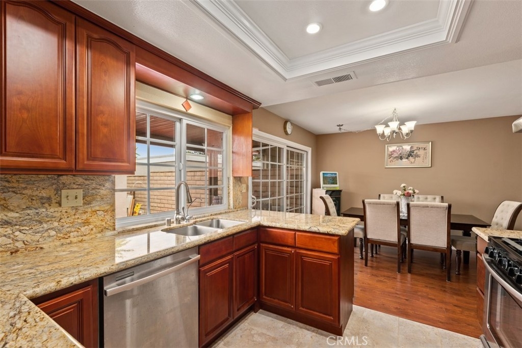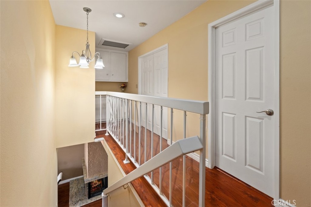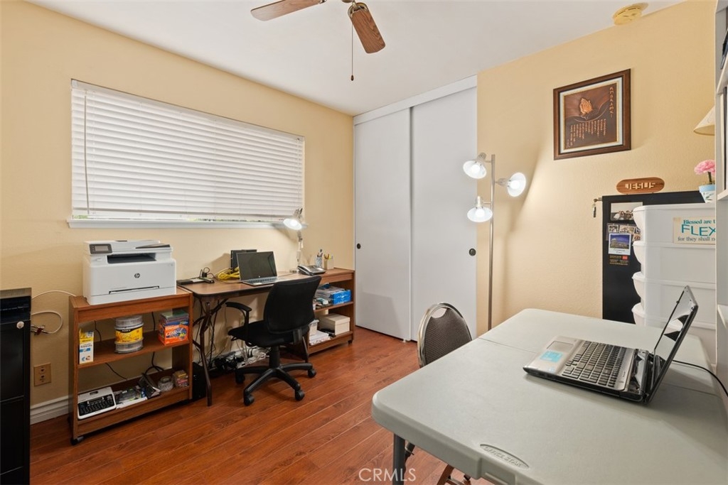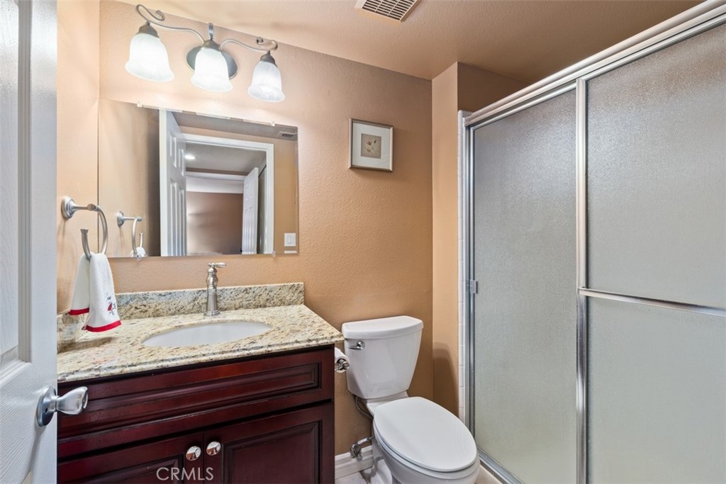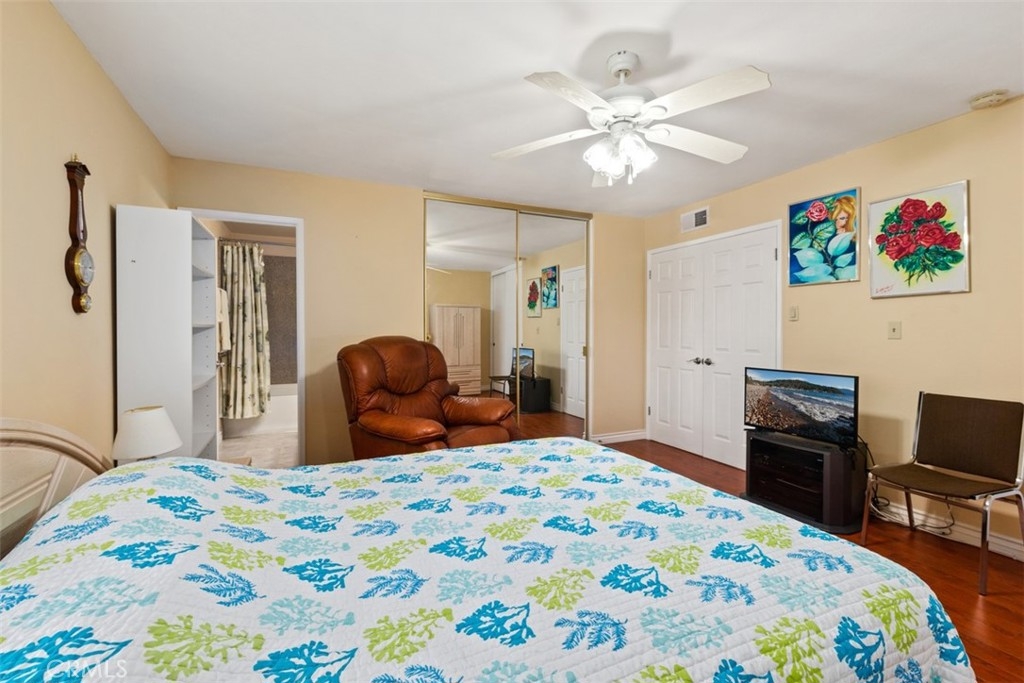 Welcome Home to this beautifully updated townhome in Valley View Park Homes! You are greeted by a lush walkway and green belt as you enter the home. The large open floor plan flows nicely through the downstairs as you enter the spacious living room with ample light. The downstairs has a sizable main floor bedroom, currently being utilized as a media music room that has an option of private entrance into a full bath. The inviting fireplace can be seen from both the living room and dining room, adding a cozy ambiance to the space. The updated kitchen features all stainless steel appliances with recessed lighting and loads of countertop space, storage and a lovely color palette. Tucked away in its own room is the laundry with a pocket door just passed the kitchen area. Upstairs you will fine 3 other very spacious bedrooms, perfect for any family! The vast primary suite boast double doors, loads of natural light and a gorgeous en suite bathroom with granite countertops and updated shower with soaking tub. Enjoy a large recently updated patio equipped with a guava tree and lovely blooming rose bushes. Enjoy your private access to your two car garage with brand new epoxy flooring. Entertain at the community pool located with this quaint gated community with controlled access. The ideal location of this spot is it is close to freeways, shops and restaurants for you to enjoy! This home truly has it all and is on the interior making it nice and quiet, a true oasis!