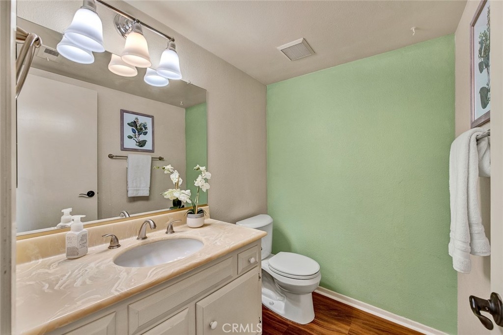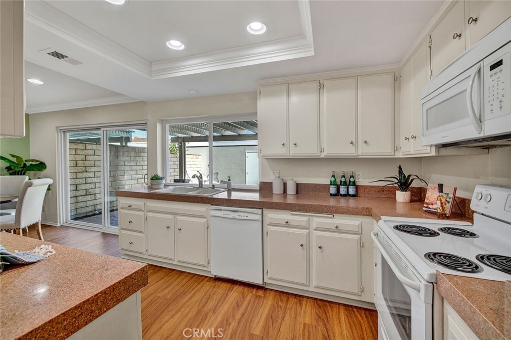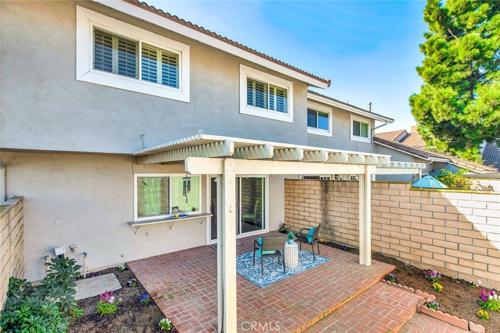 Facing a lush green belt in the gated community of Valley View Park Townhomes, this home features a bright, 2 story floor plan perfect for family living! Upgraded with dual-panel windows throughout the unit, beautiful crown molding and recessed lights throughout the downstairs, this home offers a spacious living room with cozy fireplace, and white shutters on windows and slider to front courtyard. The dining room/family area offers a slider to the spacious brick patio with latticed cover, ideal for entertaining or summer BBQs! The bright kitchen has crown molding and recessed lights as well as a pass-through window for easy access to patio entertainment. There is also a pocket door from the kitchen to separate laundry room. Washer/dryer included (but not warrantied). A handy half bath is located downstairs.. Upstairs, there are 3 bedrooms and spacious built in cabinets in the hall for linens and storage. The master bedroom offers mirrored wardrobes, an en-suite bath and beautiful shutters. The second bedroom, overlooking the patio, offers white shutters, big closet and can be used as an office/bedroom! The third bedroom offers a walk-in closet and white shutters as well. The hall bath features a full tub with shower. The patio is perfect for entertaining and family activities, and offers private access to the double garage. An easy walk to the community pool and spa, with clubhouse. Located at the junction of the 22 freeway and 405 freeway, and down Bolsa Chica Blvd. for quick access to the beach, this home is close to award-winning, highly rated schools as well!