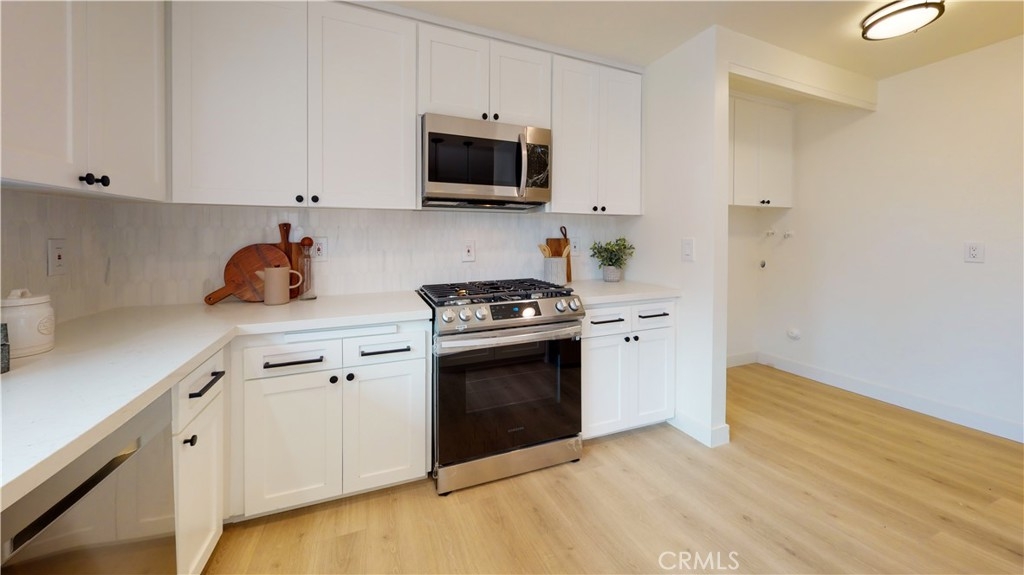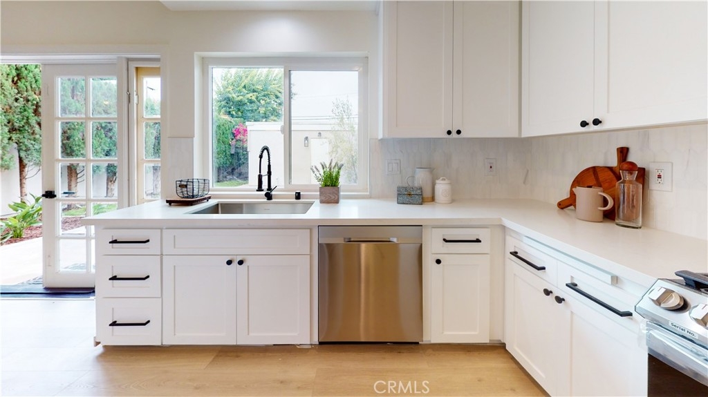Captivating and Completely Refashioned Townhome in Garden Grove! Ideally located in a quiet and highly sought-after gated community, this 3 bed & 2.5 bath, 1,808SF home conveys an abundance of charm from the very beginning with classy double entry doors. Situated as a two-story, end-unit, the interior sparkles with luminous natural light, an exclusive color palette, modern wood flooring, beautiful plantation shutters, stylish light fixtures, and an expansive living room with an contemporary fireplace. Follow the open flowing floorplan to the reimagined and fashionable kitchen featuring solid countertops, ample white shaker cabinetry with new sleek hardware, a shimmering tile backsplash, recessed lighting, premium finishes, new stainless appliances, and an adjacent dining area with gorgeous French doors to the outdoor space. Relax with friends and drink ice cold beverages, while eating dinner on your large concrete patio. You will begin every day in your large main bedroom with a deep walk in closet and a spa-like en suite. Two additional bedrooms offer an abundance of space and are perfect for guests, children, or your home office & gym. Other features: detached 2-car garage, remodeled bathrooms, central HVAC, laundry area, less than 15-minutes from multiple beaches and only minutes from Disneyland, close to trendy restaurants, I-405, highways, shopping, coffee shops, and schools, and so much more! With so much to offer, this remodeled turnkey townhome is your dream!