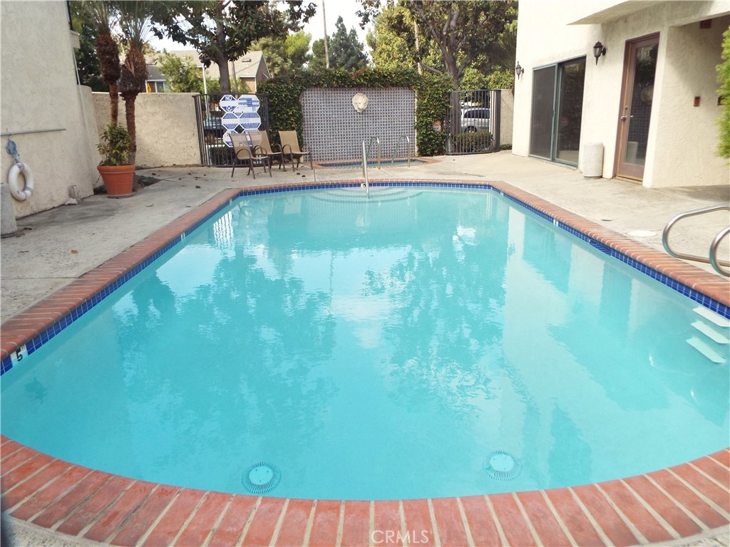 This ground level single story home is ideally located in a small complex about a mile from the 22 freeway and has it all, 2 bedrooms, 2 baths, full size indoor laundry and 2-car garage. Tile floors throughout. The living room has a raised hearth tile fireplace with custom mantel. Large dining area. Tile counter kitchen with gas range, microwave, stainless steel sink, cabinets galore and a French Door to the rear patio. The master suite features a slider to the patio and a wall of closets with mirrored doors. The guest bedroom has a mirrored door closet and adjacent full bath. Raised panel doors. Private walled off patio. Close to community pool and spa.