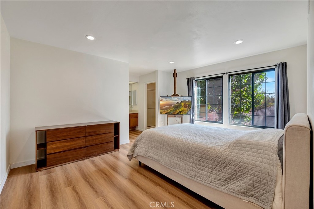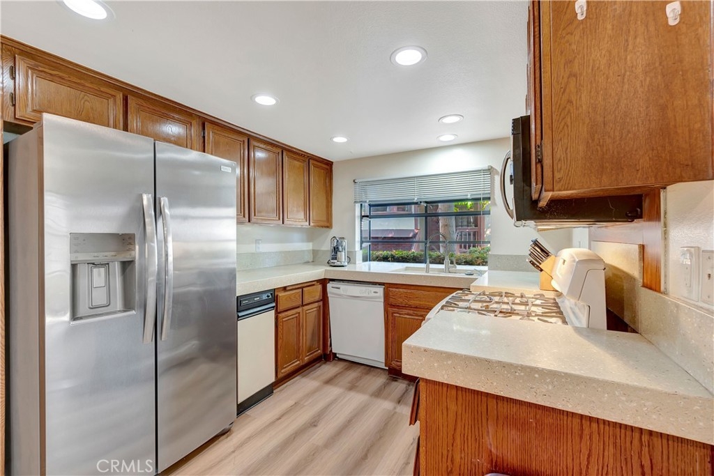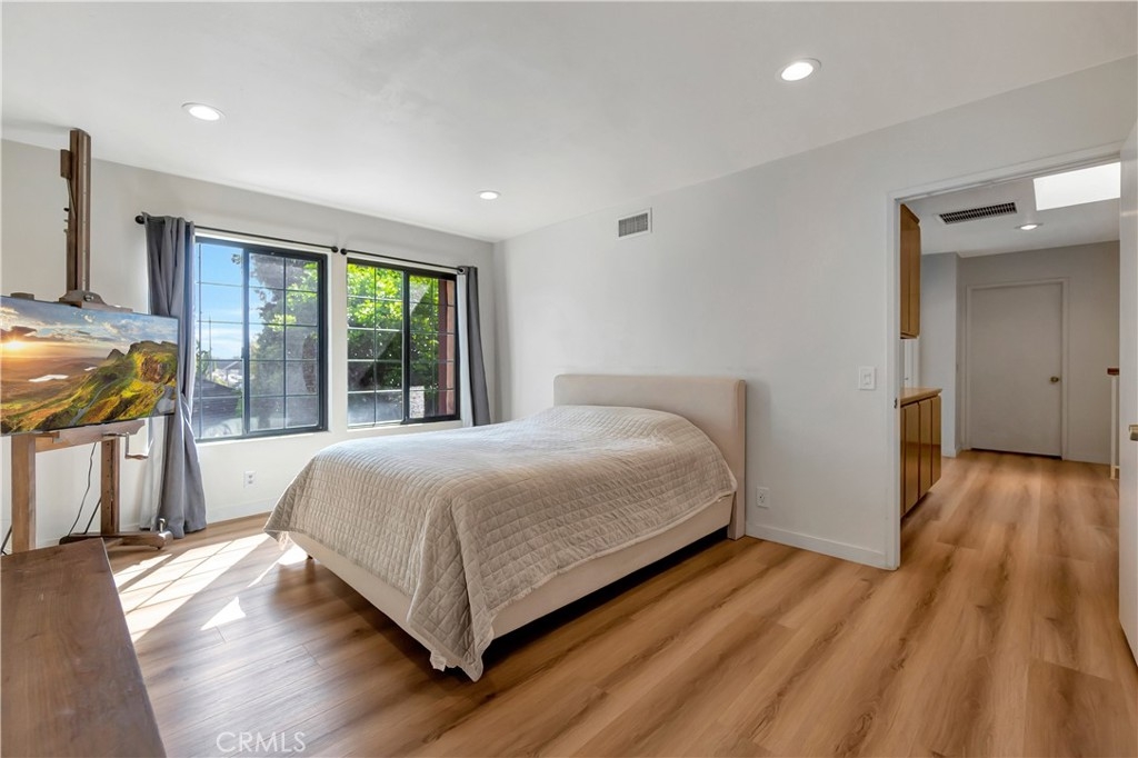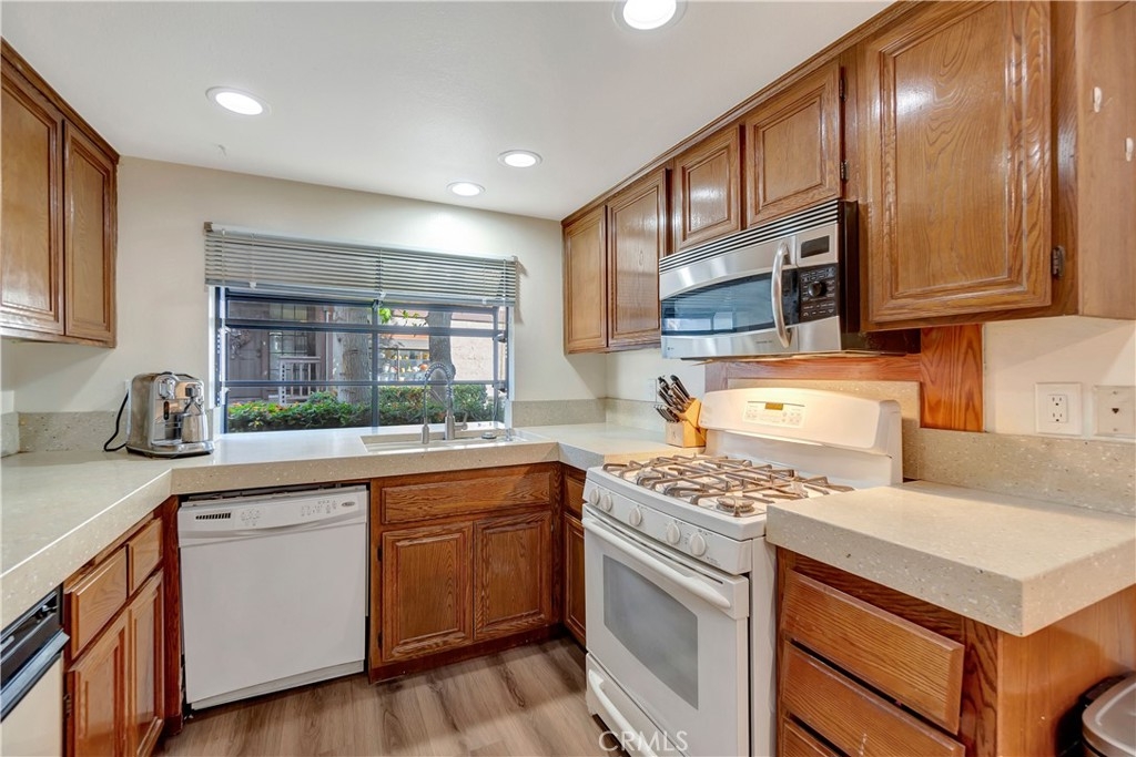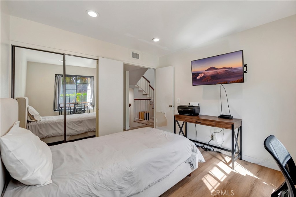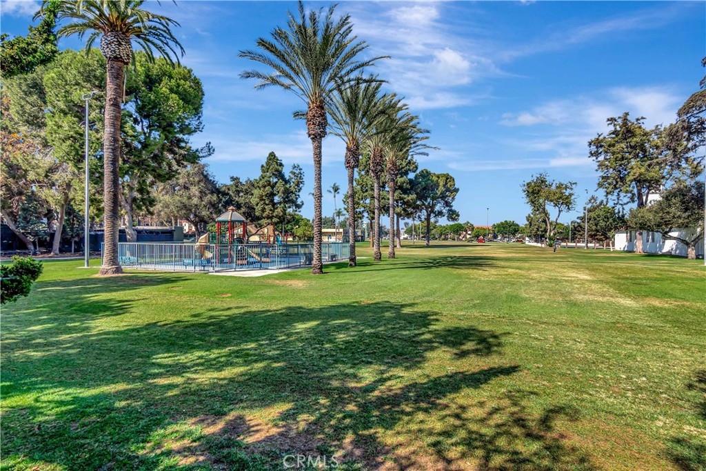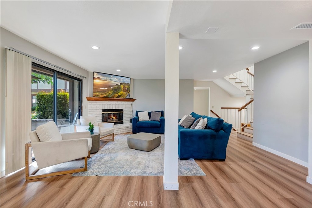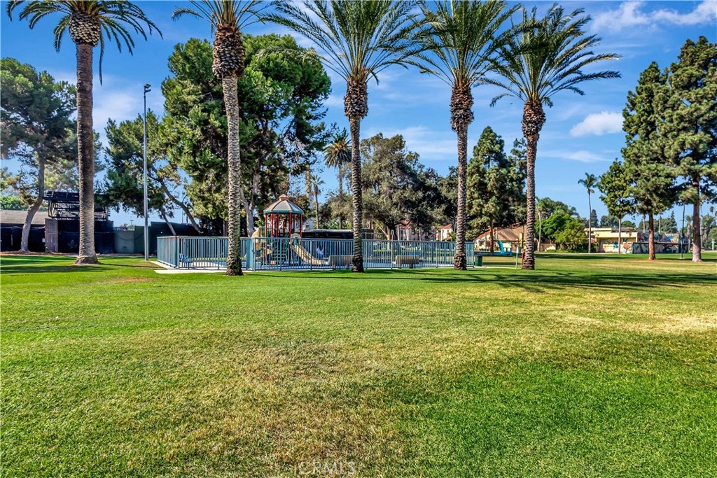 Nestled within the charming Acacia Park community of Garden Grove, this exceptional 4-bedroom, 3-bath end-unit home is a rare find in the market. Spanning over 1,700 square feet, this residence showcases elegant hard surface flooring and features central air conditioning, along with a convenient main-level bedroom and bathroom. The spacious great room is enhanced by a large brick fireplace and a sliding glass door that leads to a sunny patio overlooking the community pool. On the upper level, you will discover two generously sized guest bedrooms in addition to the primary suite, which boasts an attached bathroom and a walk-in closet. A conveniently located laundry room is also situated on this floor. The property includes an attached two-car garage with direct access and an EV charging station. Situated within a beautifully gated community, just steps away from the pool, spa, and clubhouse, this home is ideally located near excellent schools, the Garden Grove library, theme parks, shopping, dining options such as the Steelcraft outdoor food court, and major freeways. This property represents an extraordinary opportunity!