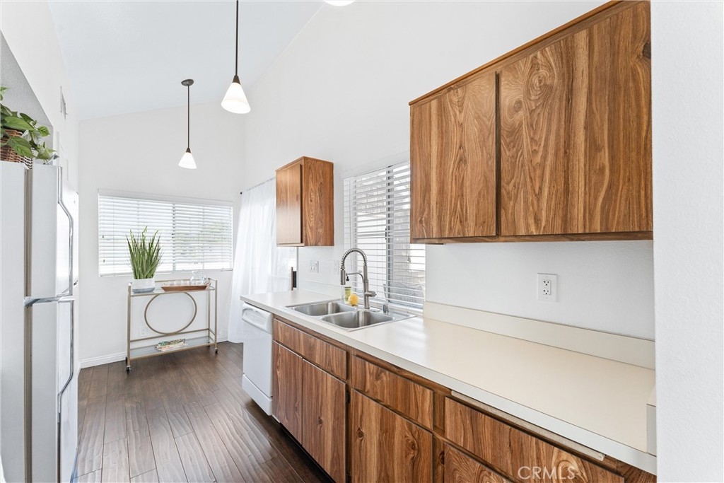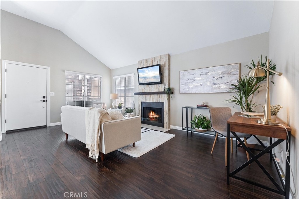 STYLISH CONDO GEM !Located in a tranquil area 0f Lake Grove. This condo offers a peaceful retreat w/ modern amenities. As you enter, you are greeted by laminate flooring that runs seamlessly throughout the entire space, offering durability & easy maintenance. Natural lights streams in through the large window offering view of the balcony from the living room. Living room cozy yet spacious enough for a comfortable sofa set, a coffee table & an entertainment center if desired. Highlighted by showcasing a fireplace w/ a stacked stone feature wall & a custom wood mantle, creating a warm & inviting atmosphere. The bedroom, located off the living room, comfortably fits a king-sized bed & includes a sizable closet w/ shoes cubbies & shelving, maximizing space efficiency. A large window in the bedroom allows for plenty of natural light. The bathroom is conveniently located near the bedroom & living areas, offering a bathtub/shower combination, a vanity w/ storage space underneath, & a toilet. The dining area is ideal for enjoying meals & small gatherings. The kitchen is situated at the end of the main living area. It is equipped with all the essentials for cooking & meal preparation, including ample counter space & storage in shaker-style vanity cabinets. At the end of the kitchen is a versatile area that can be use as a study area or casual dining. Front door off the living room, leads you onto a private balcony. This outdoor space is perfect for enjoying fresh air and relaxation, with enough room to set up a sitting area. This sets this balcony apart is its integrated laundry area, equipped w/ connections for a washer & dryer. This feature is not only convenient but also mitigates the risk of water damage inside the condo if a washer were to leak. The new AC system was installed in 2018 ensures comfortable temperatures year-round, complementing the efficient heating system already in place. Additional unit specific, Hot water shut off valve has been installed for emergency water leak in the unit. Conveniently located detached two-car garage nearby, providing secure parking & 2 extra storage space for other belongings. In summary, this one-bedroom, one-bathroom condo with a balcony, integrated laundry area, and detached two-car garage offers a blend of comfort, functionality, and practicality in a serene community combined with resort style feel. HOA includes water & trash. Excellent location near shopping, entertainment, Costco, etc. DON'T MISS OUT!