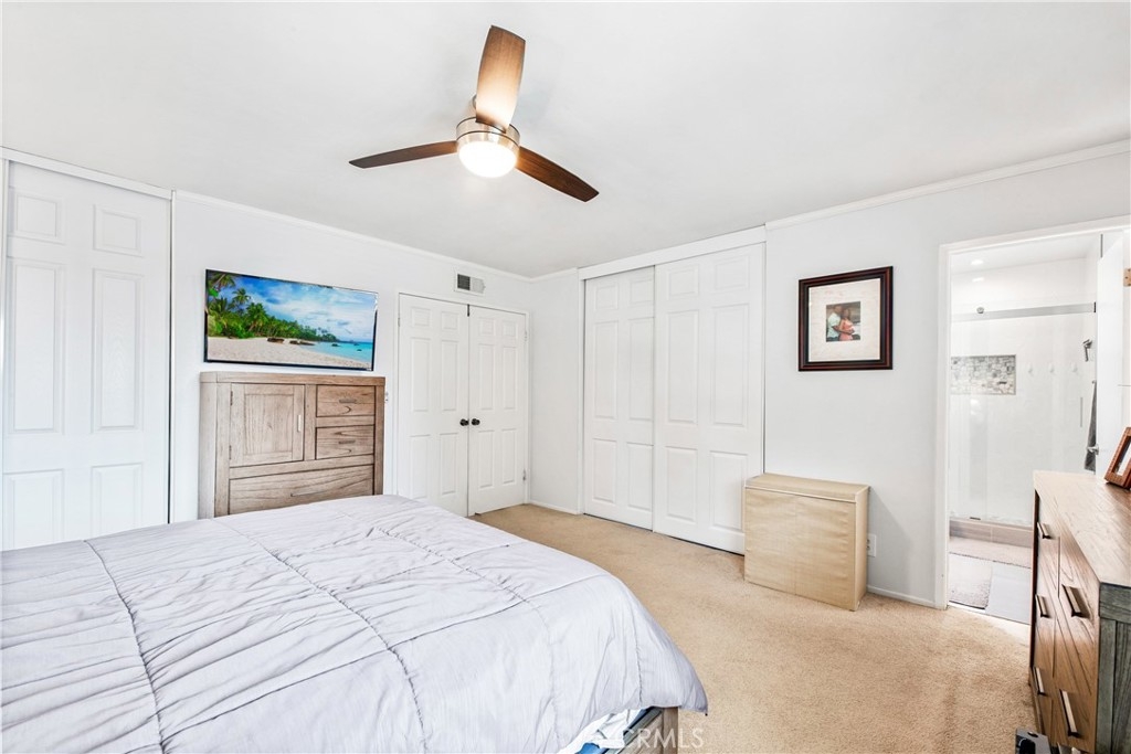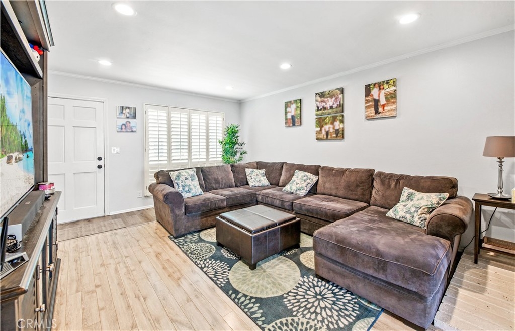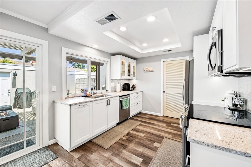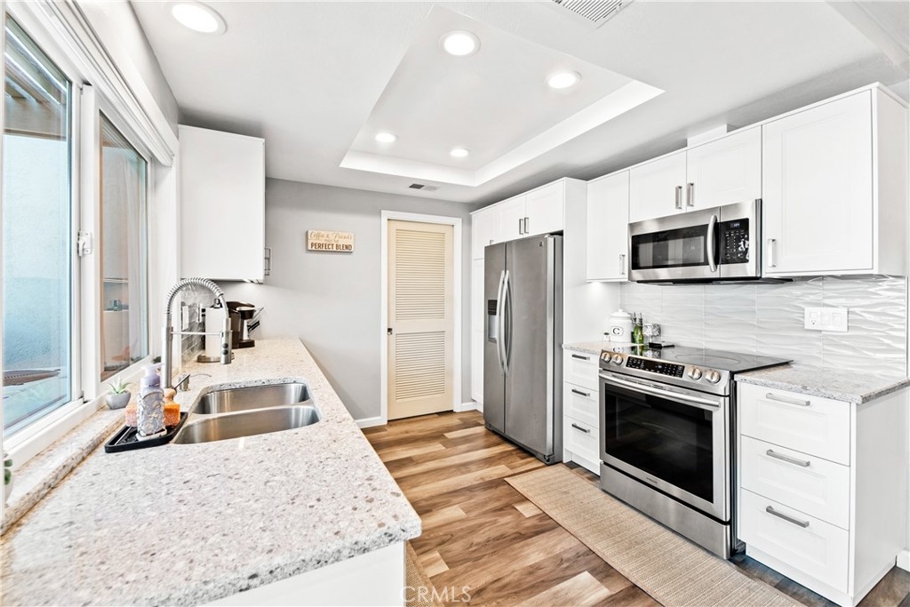 Location! Location! Location! Nestled within the quaint and gated community of Valley View Townhomes. This 4 bedroom, 3 bathroom, Townhome is centrally located within the community, close to guest parking spaces, the community clubhouse and the community pool. With views of the greenbelt and walking paths, this home checks all the boxes! Featuring vinyl laminate flooring, smooth ceilings, recessed lighting, crown molding, solar tubes providing natural light, dual pane white vinyl windows, water softener and air conditioning. This home has upgrades galore. The kitchen has been remodeled with white shaker cabinets and quartz countertops. And all 3 bathrooms have been beautifully remodeled in all the on trend colors and styles as well. The patio is also upgraded with a pebbled surface and custom patio cover. With a lower level bedroom and full bathroom, this home truly has it all!!!