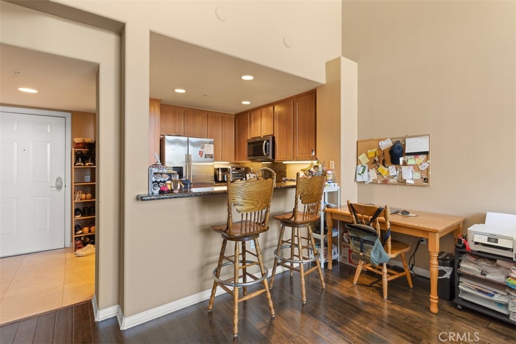 This beautifully maintained 2-bedroom, 2-bath with a loft end-unit condo redefines modern city living. Featuring a functional kitchen island, hardwood floors, and granite countertops throughout, the home combines thoughtful design with luxurious finishes. The open layout flows from kitchen to living room. Relax in your primary suite with a custom walk-in closet, or indulge in long, warm baths in either of the two full-size bathrooms, each with shower-over-tub and granite surfaces. The private balcony is your front-row seat to the nightly Disneyland fireworks and city lights, making every evening magical. This unit provides privacy with only one common wall, and convenience with in-unit laundry, 3 assigned parking spaces near the elevator, extra storage, and resort-style amenities—including a gym, clubhouse with WiFi, and a pool & spa. HOA covers water, gas, and trash, making this a truly turn-key, vacation-style home you’ll never want to leave.