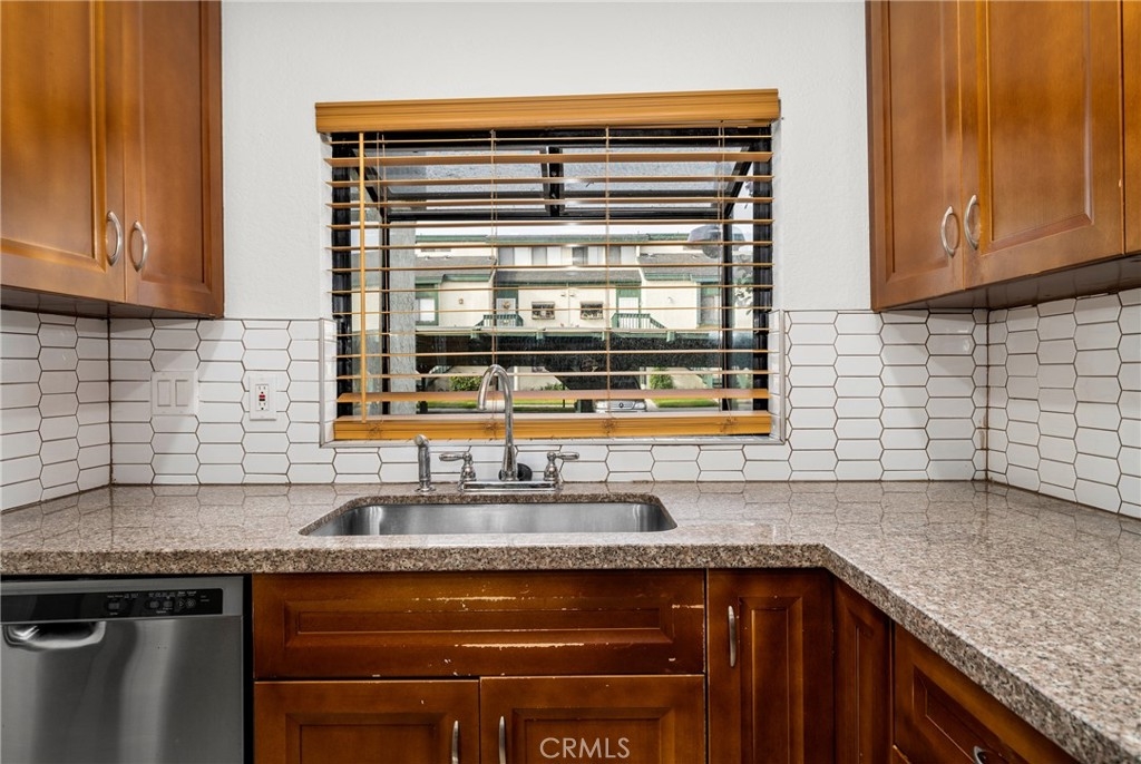 Amazing 2 bedroom, 2 bath downstairs condo is a gated community. Freshly painted and cleaned and ready to move in! Upgraded bath with newer tile and counter top/sink. Kitchen has been upgraded with granite counters and tile back splash. Dining area opens to living room that has a sliding door to a partially covered private patio, with a gate to the greenbelt area. Primary en-suite bedroom also had slider that opens to patio. Laundry is in the second bathroom and has hook-ups for both washer and dryer. Two assigned parking spaces in carport and any uncovered parking is open for guests. Gated pool with bathrooms steps away from the unit. Close to amenities, shopping, 22 freeway, major streets and the Haster Basin Recreation Area. This is priced to sell and move in ready.