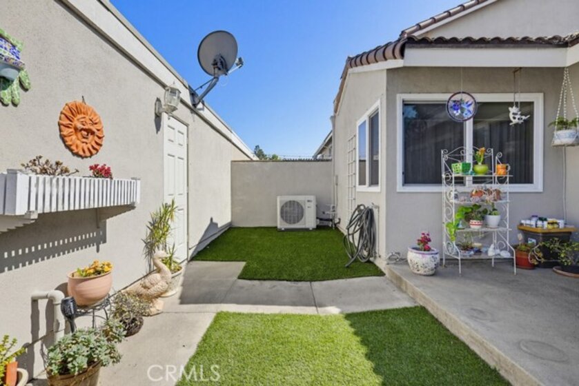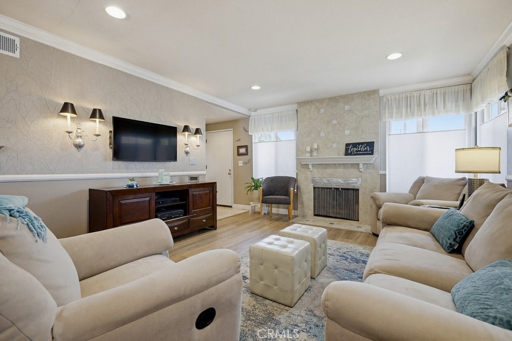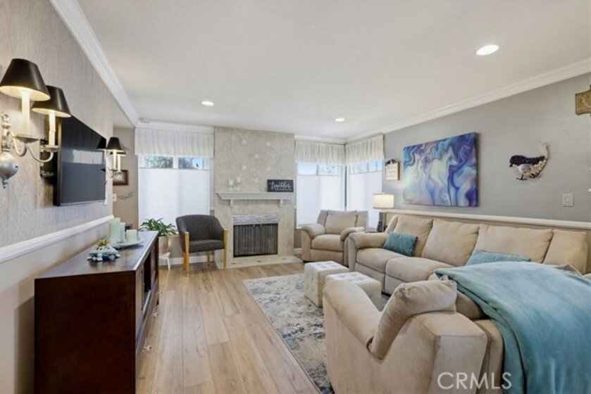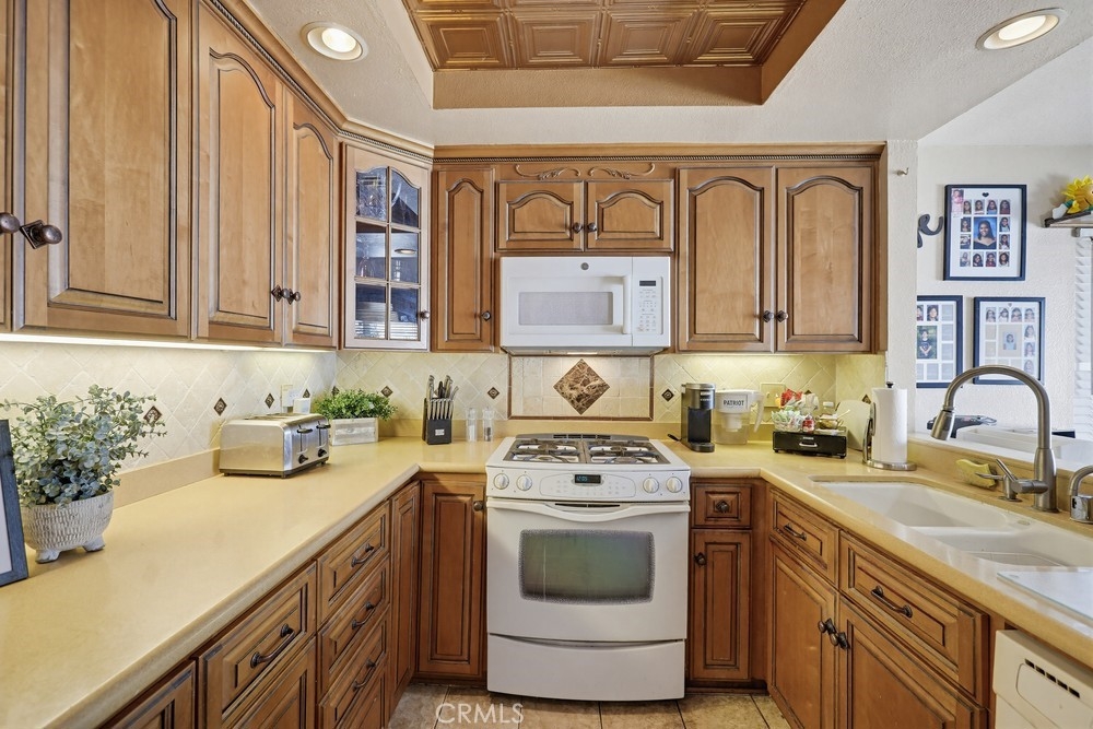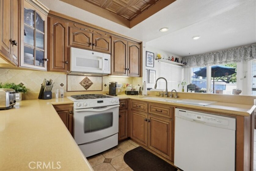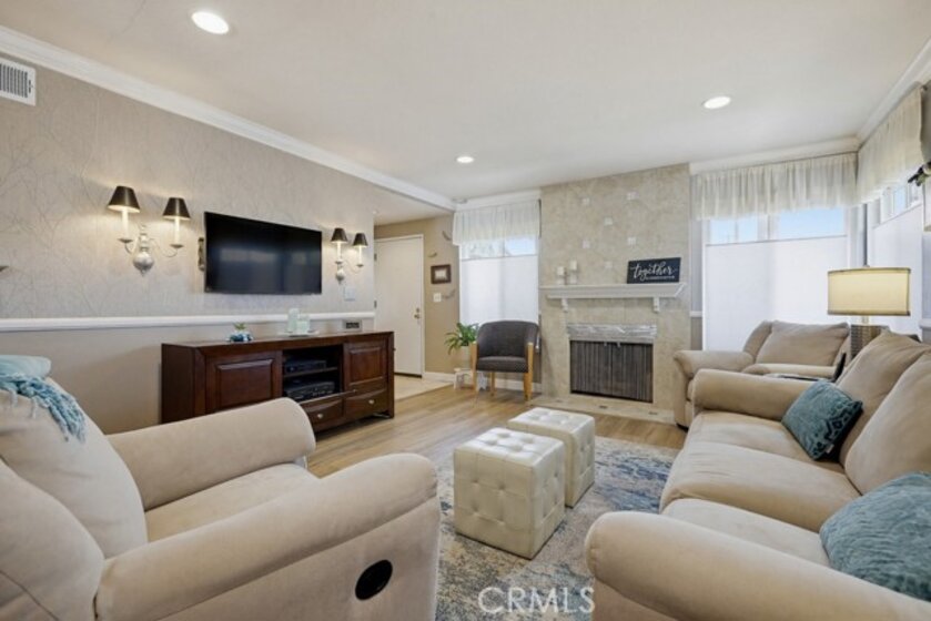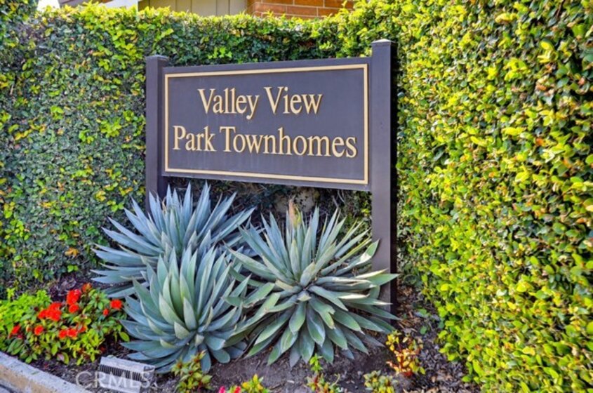 Highly sought-after Valley View Townhome gated complex. This 2-bedroom 2-bath townhome has been tastefully upgraded throughout. The spacious living room/dining room combination features a remodeled cozy fireplace and mantle as well as smooth ceilings, recessed lighting, crown molding, and an on-trend color palette. The Kitchen features maple cabinetry and granite countertops, with newer appliances. Inside laundry stackable units remain with the sale. The primary bedroom has an en-suite bathroom with a custom tiled walk-in shower. The small seating area next to the kitchen is perfect for a home office or additional dining table. The light and bright rear patio has been landscaped with stepping stones turf and potted plants for a parklike, relaxing setting.